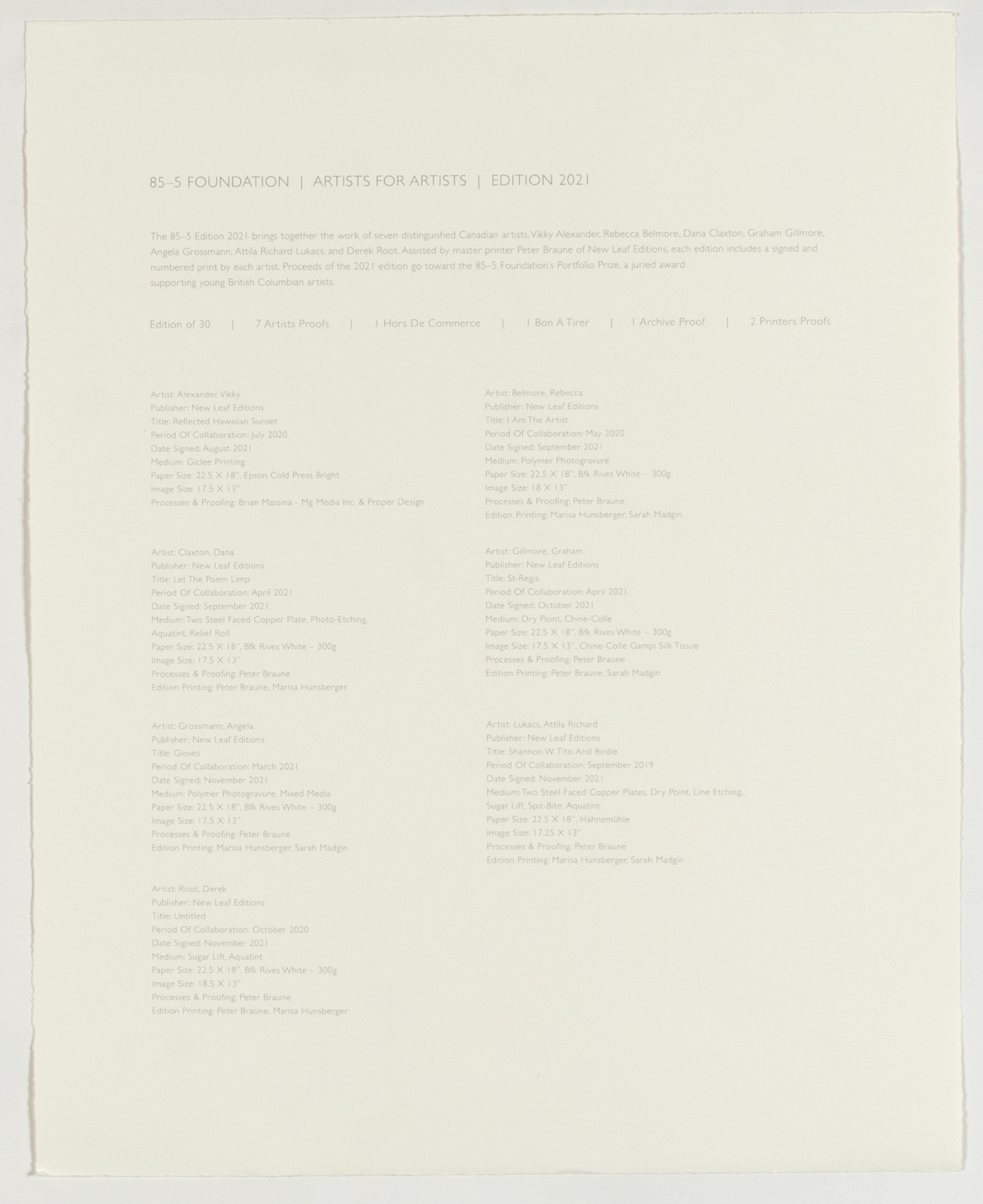 Colophon: The Portfolio Collective's 2021 Artist for Artist Edition series Graham Gillmore, Angela Grossman, Attila Richard Lukacs, Derek Root, Vikky Alexander, Rebecca Belmore, Dana Claxton