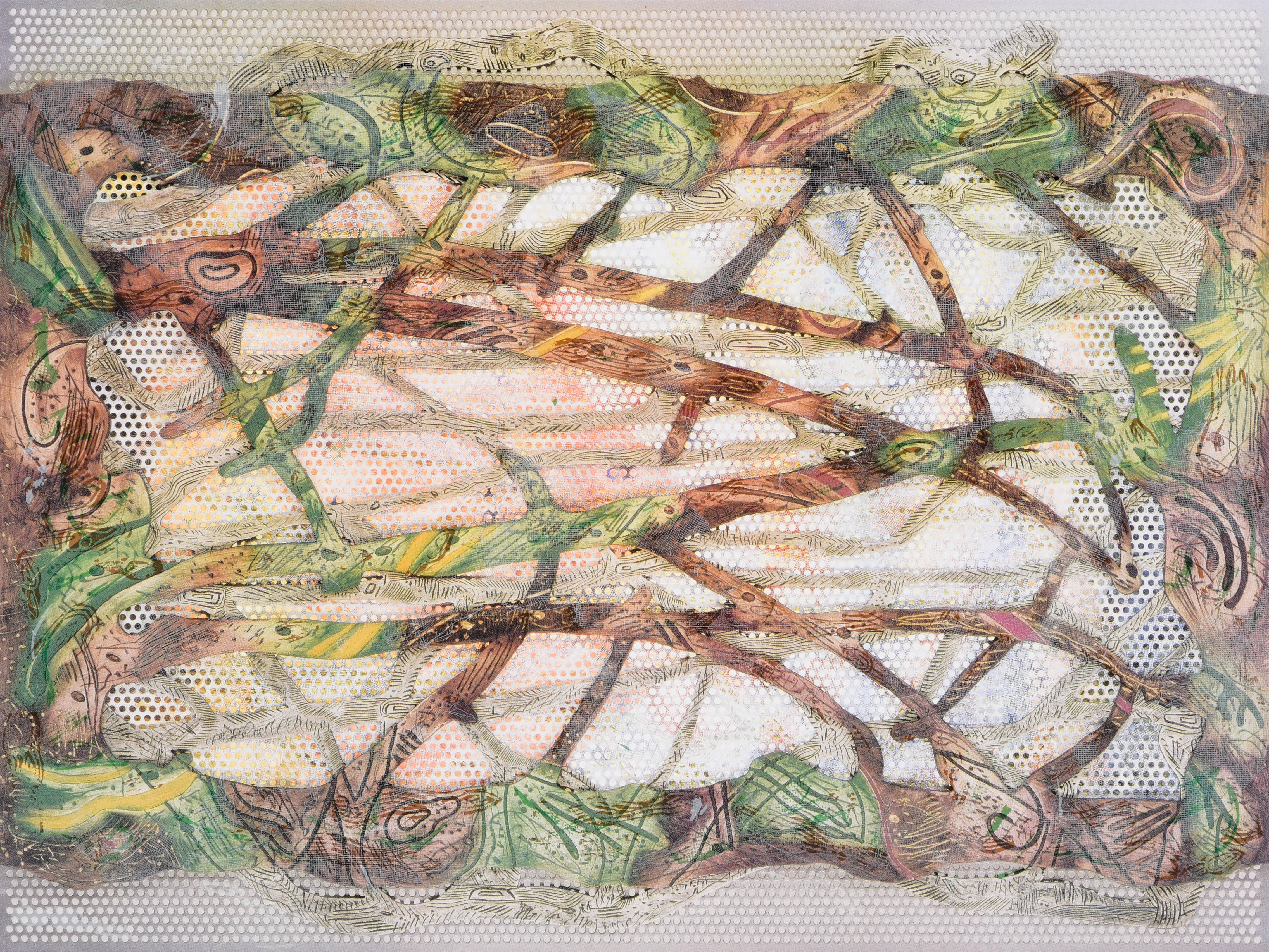 - interlocking branches against a dotted white background.