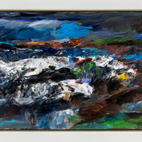 abstract landscape and body of water created through splashes of paint in various colours (green, brown, blue, red, white)