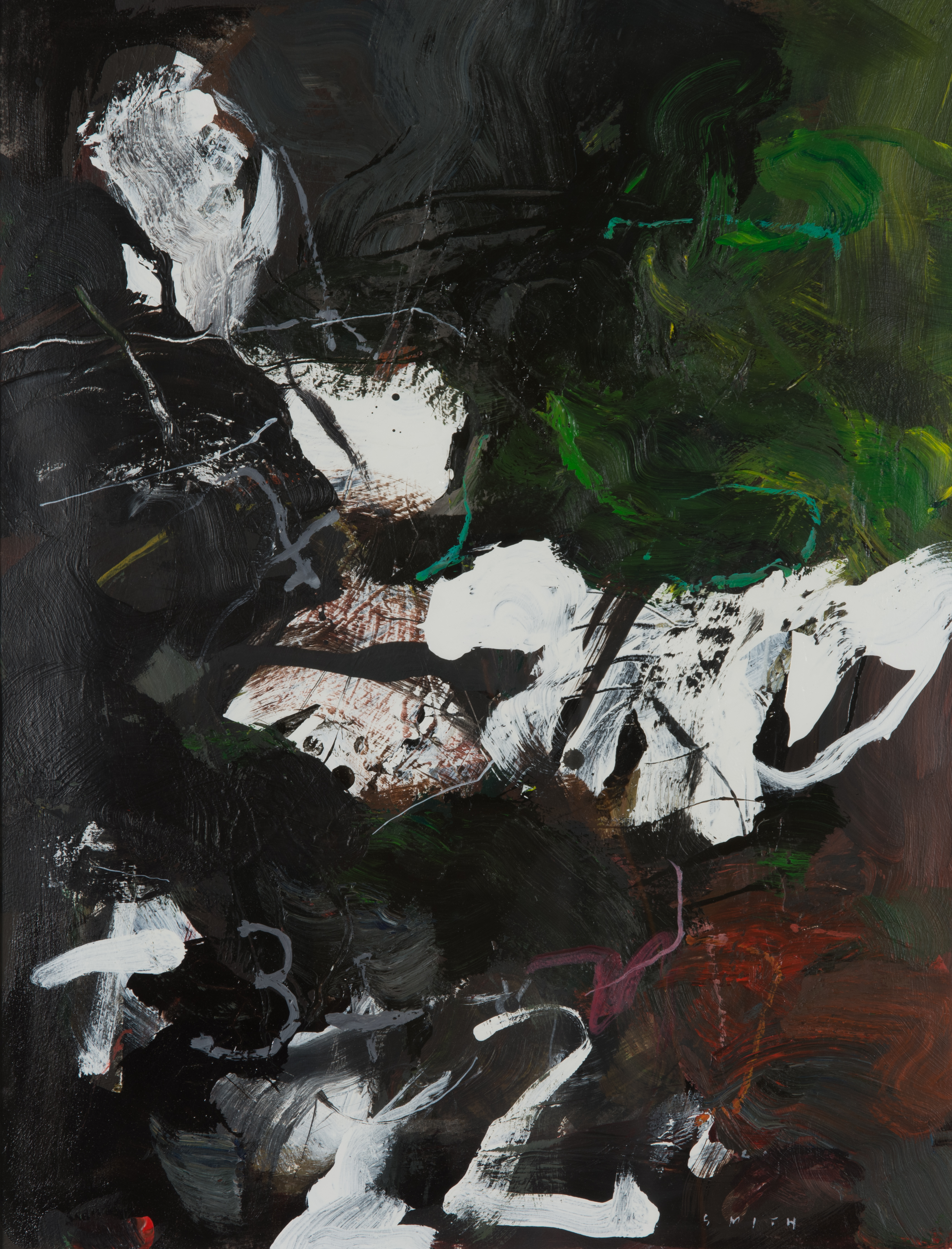 white splashes against a dark background consisting of red, green, and black.