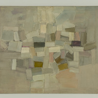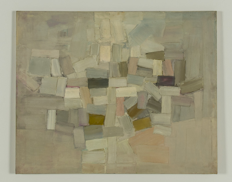 abstract shapes likely created by a palette knife in muted colour scheme (varying shades of beige and browns) - Donated by