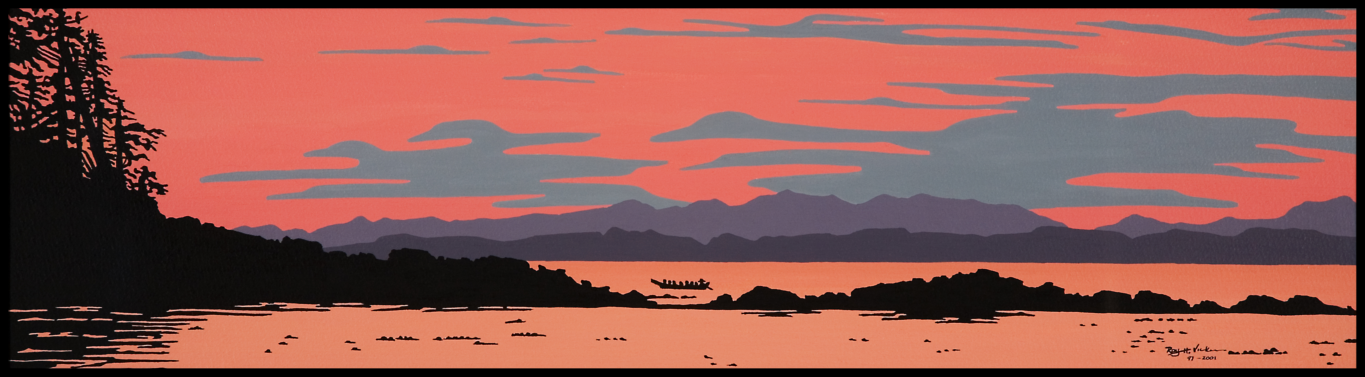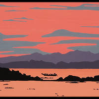a canoe and landscape by a body of water against a red sky.