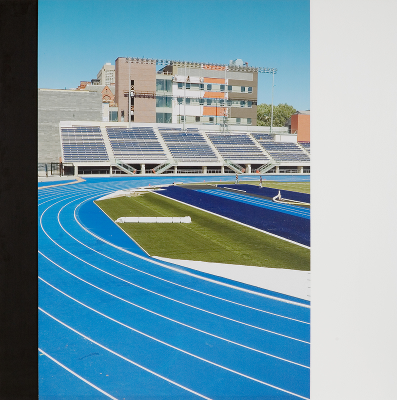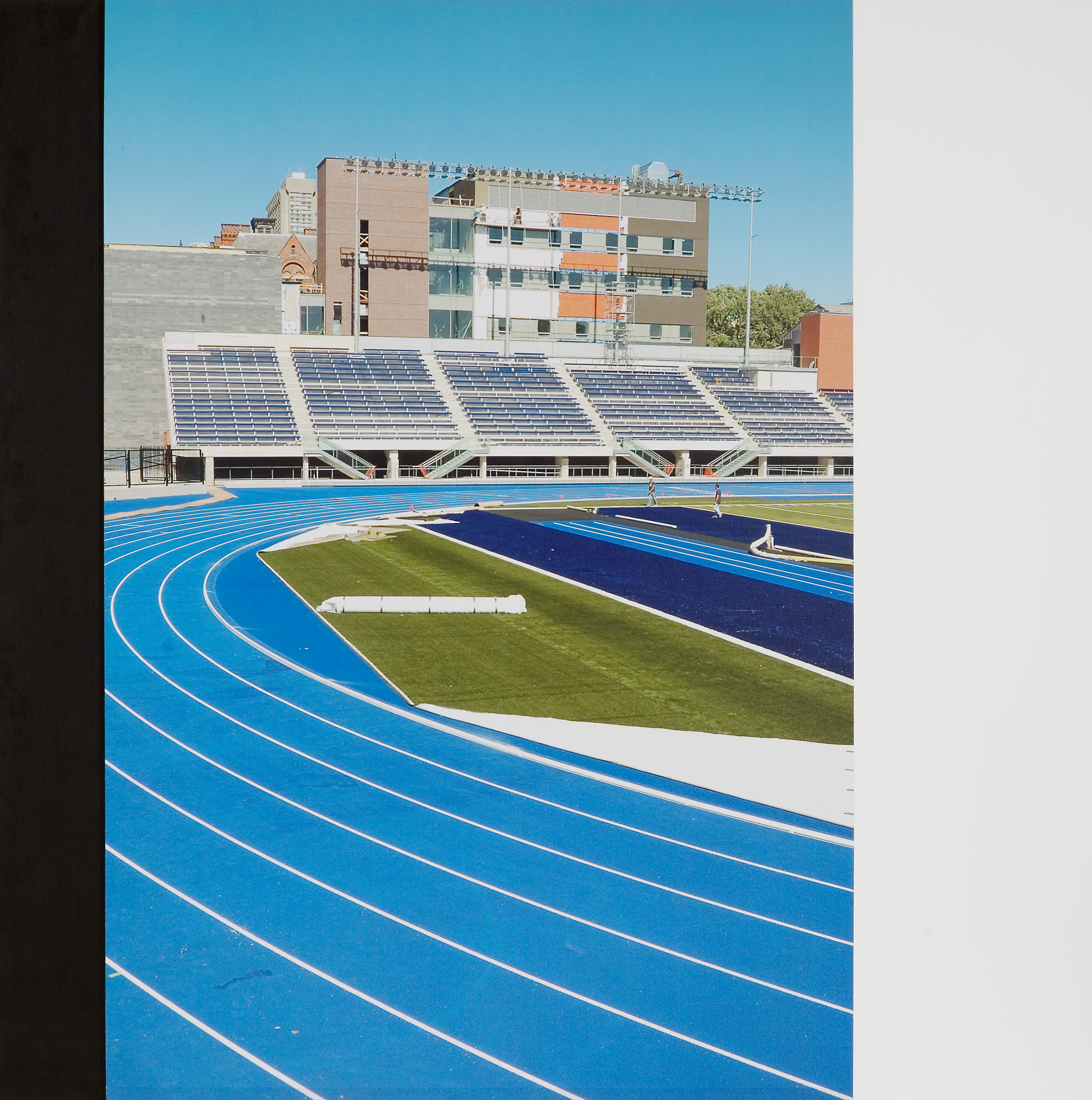 - image of a blue track with bleachers against buildings in the background on clear blue sky.