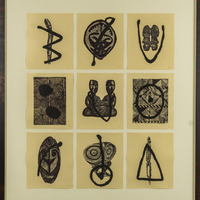 a series of nine intaglio prints, each featuring a different abstract of figures and/or shapes.