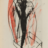 - black figure-like shape located in a rectangular shape against red streaks in the background.