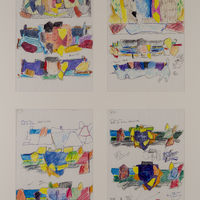 a series of four sketches rendered coloured pencils and ink.