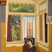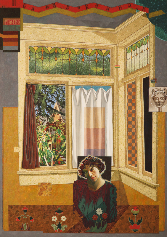 abstract painting with a single male painting in the centre with architecture as the backdrop (corner with stained glass windows) and features collage-like elements.