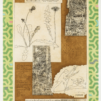 line drawings of plants (top left, center, top right), figures (bottom right) and a series of text (bottom right) against a brown background with a patterned green border.