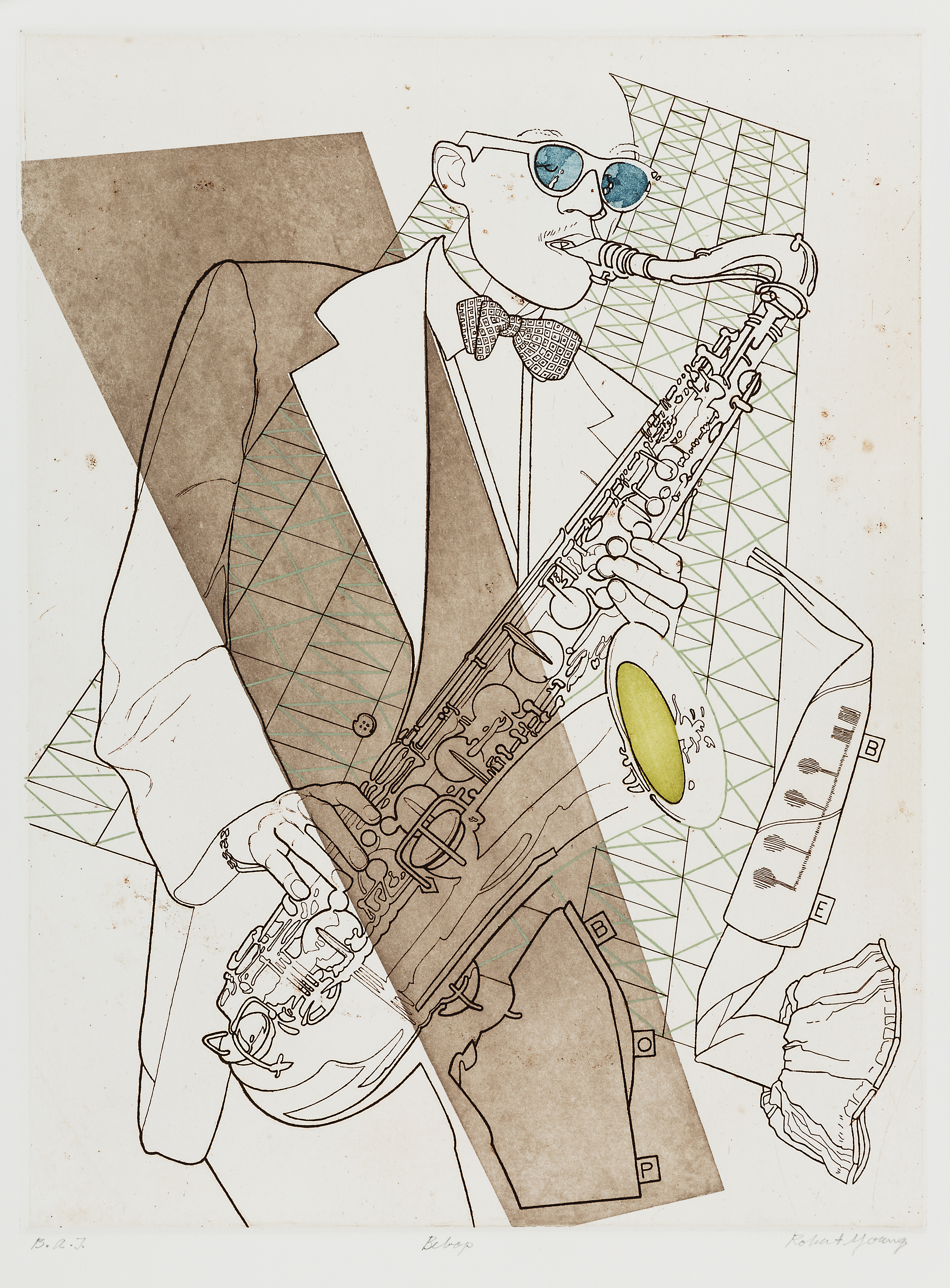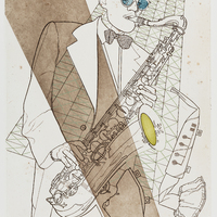 a stylized line illustration of a man playing a saxophone with a graphic background and a brown diagonal bar across.