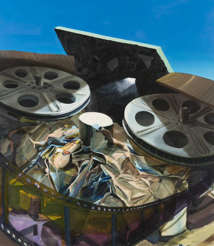 - still-life of two film reels among other equipment against a blue background.