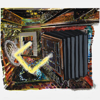 - abstracted architectural-inspired composition with a yellow ray of light bouncing off of it.