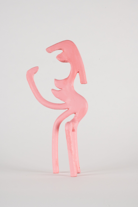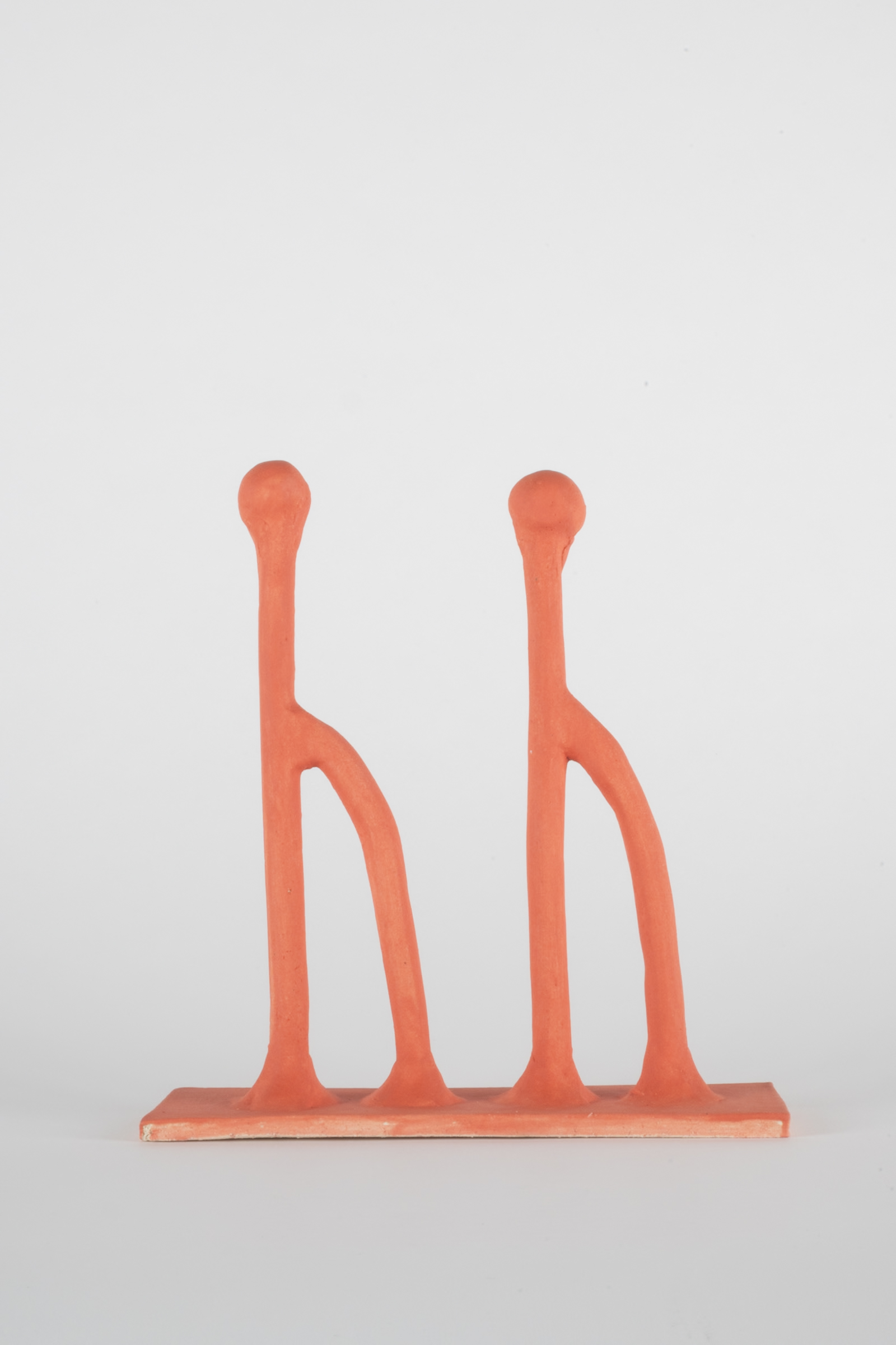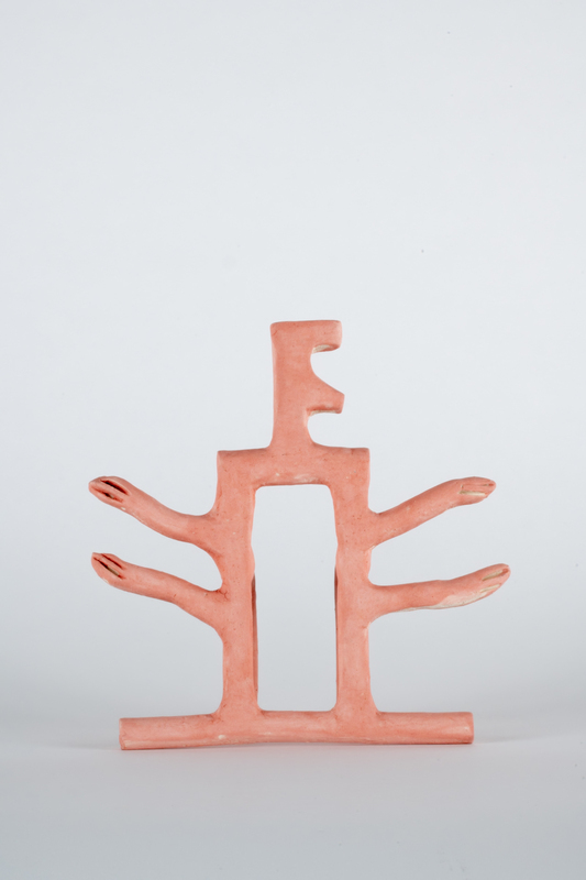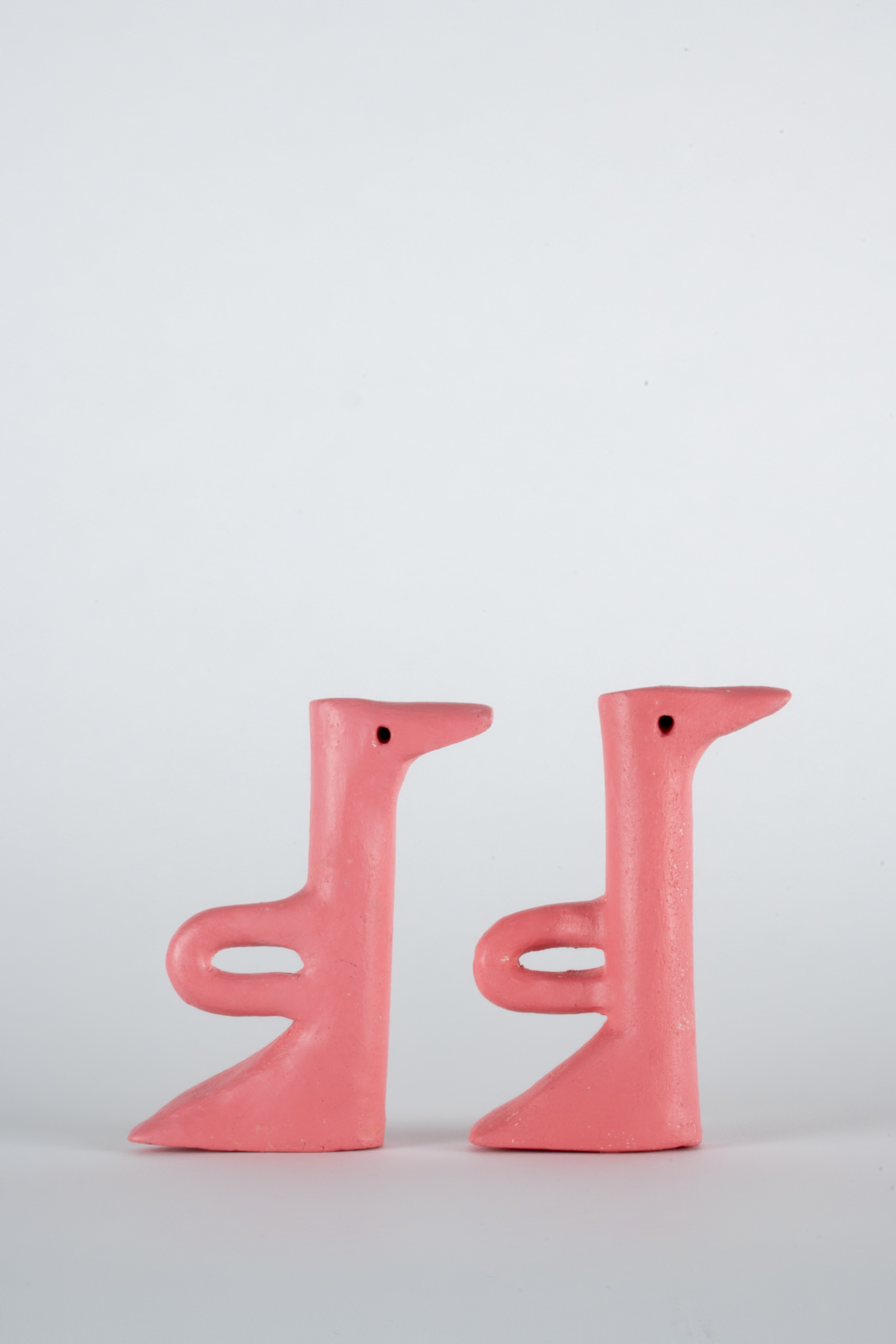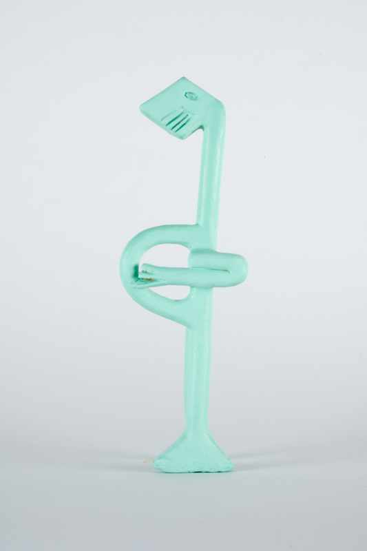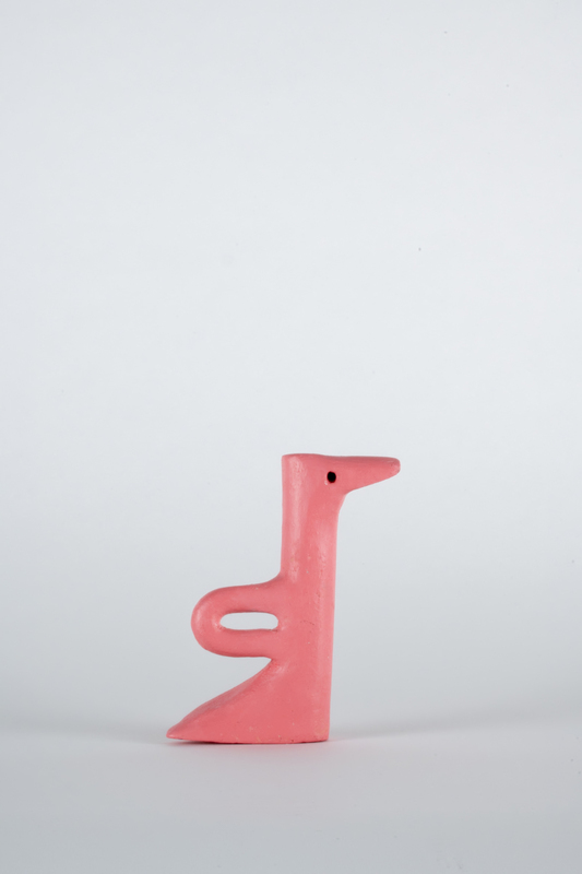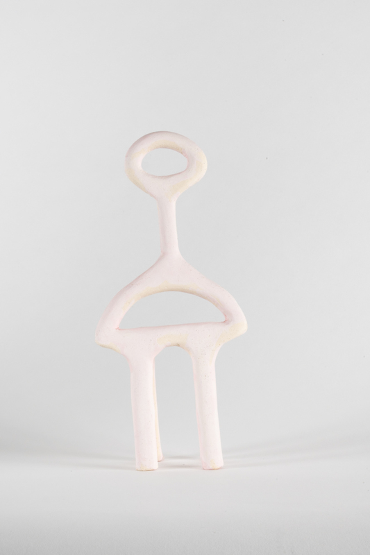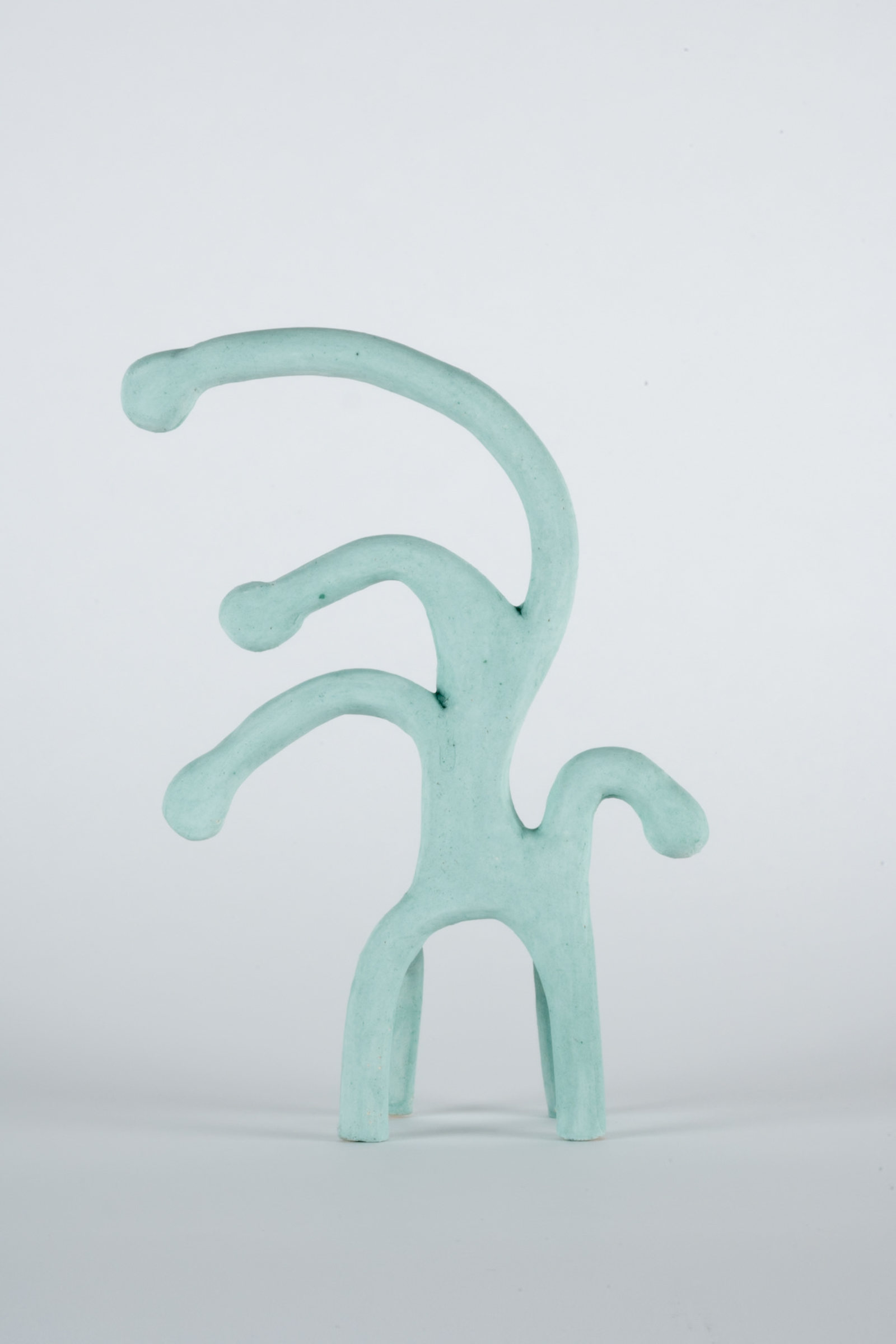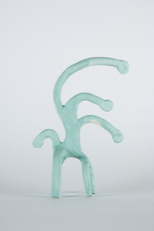 Ceramic figurative sculptures in soft green, yellow, pink and orange.