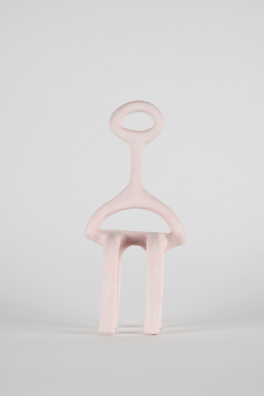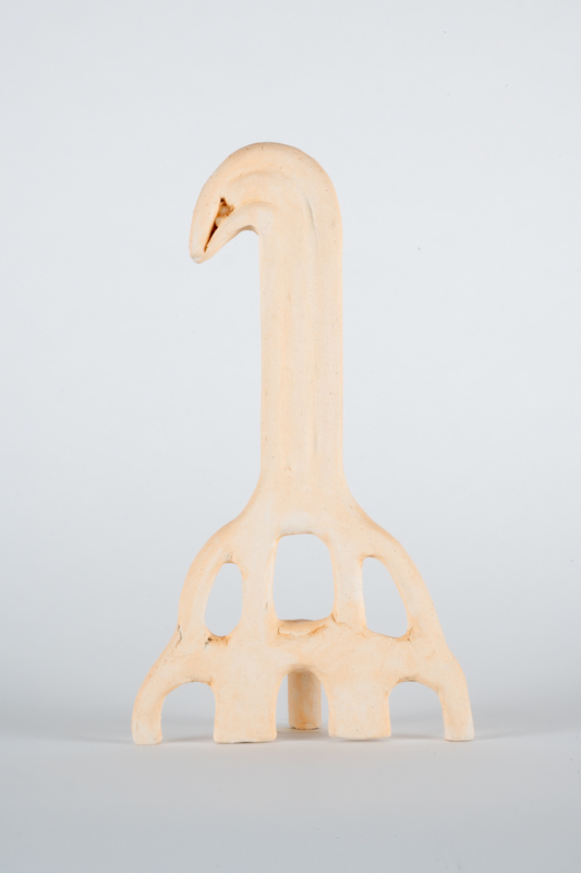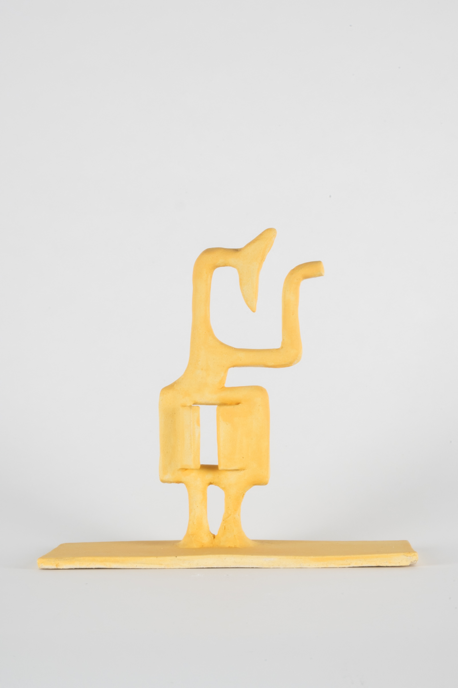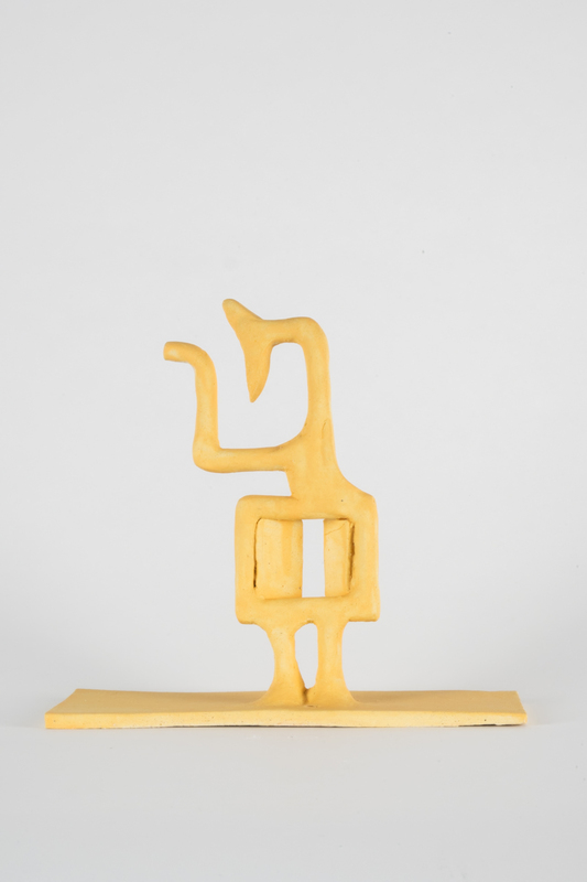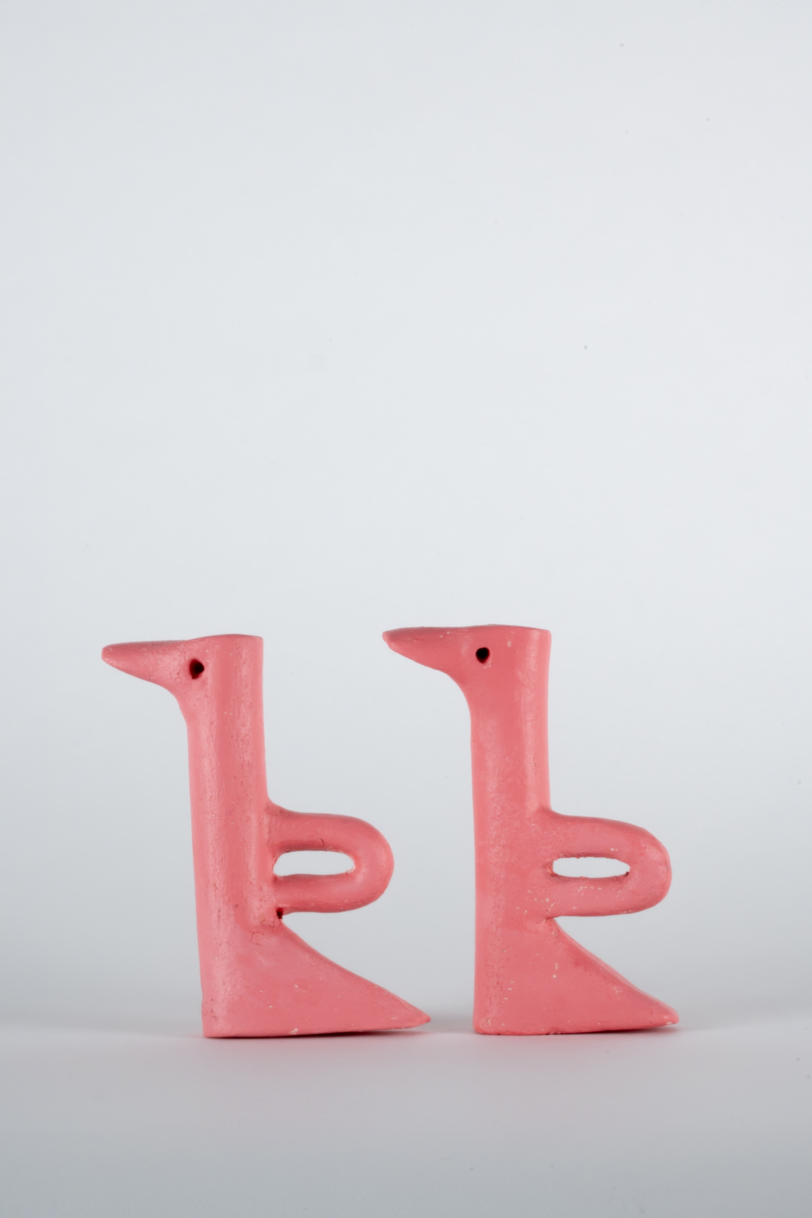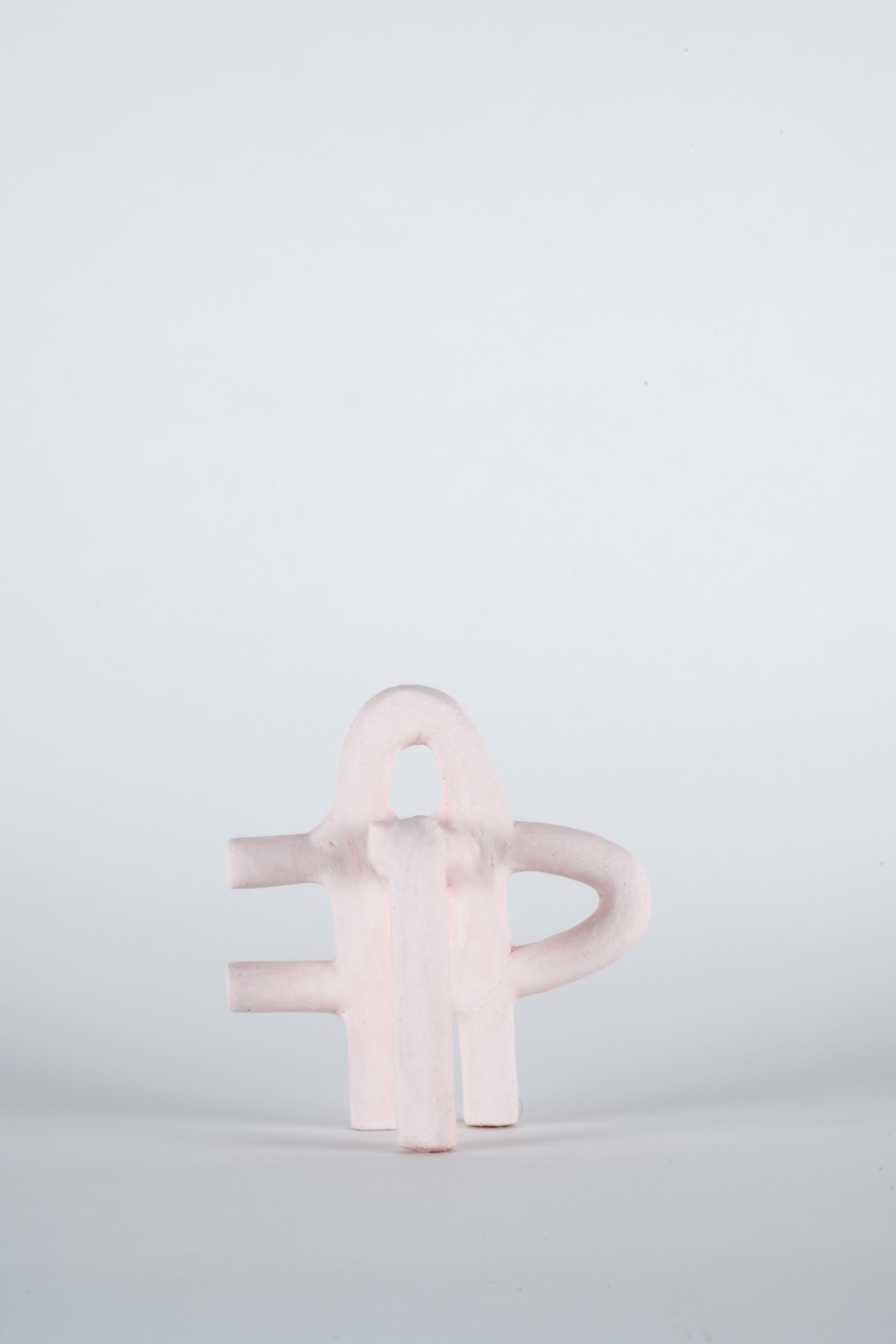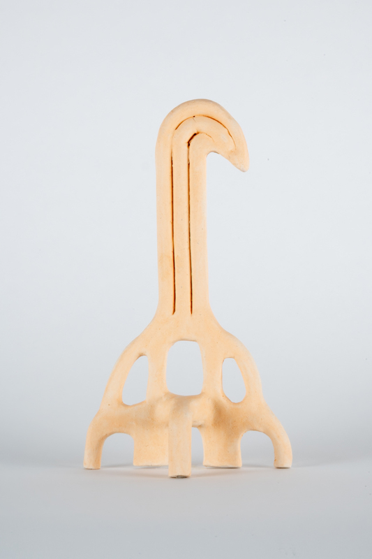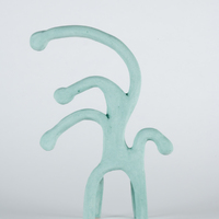 Ceramic figurative sculptures in soft green, yellow, pink and orange.