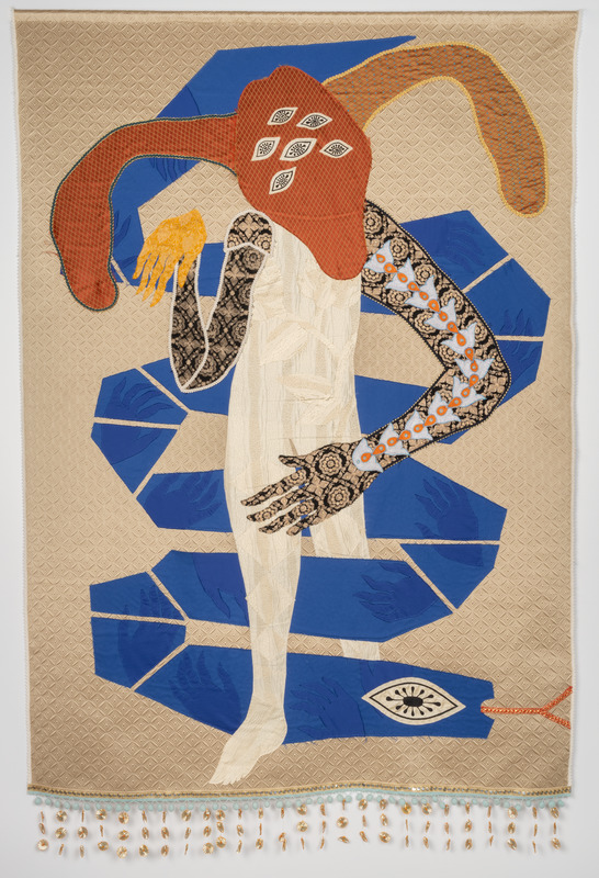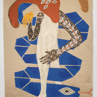 - a mythical creature with horns, holding a yellow abstracted object, standing between a stream of blue geometric shapes against a beige background.