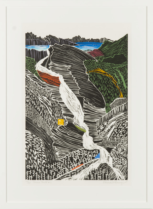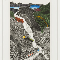 abstract landscape consisting mountains and streams of water, rendered in mostly black with occasional pops of colour (red, yellow, purple, blue, green).