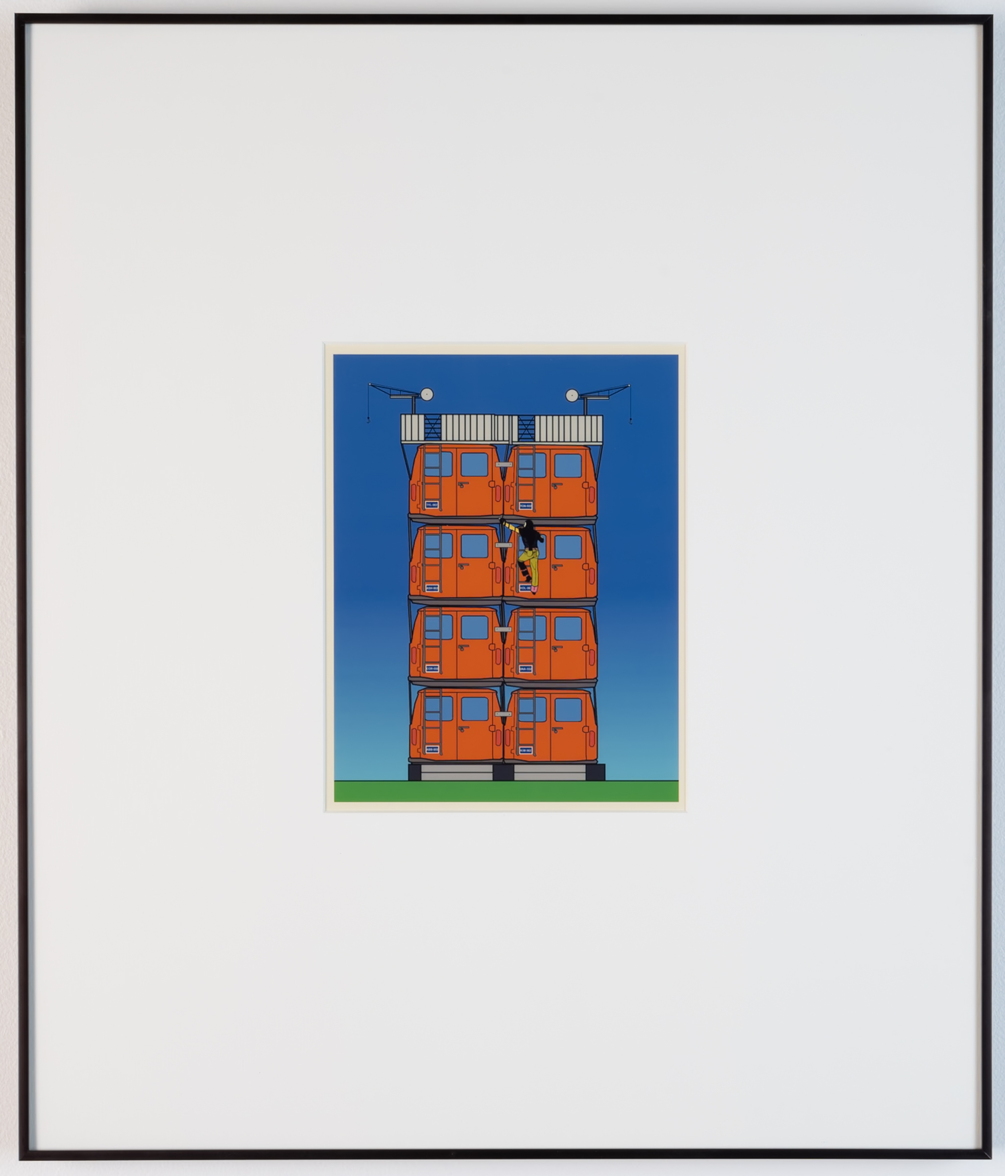 a speculative house built from cars as condo towers with a figure climbing on the cars.