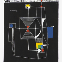 a series of abstract shapes (rectangle, circle) in white against a black background with occasional pops of colour (yellow, red, purple, green)