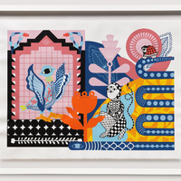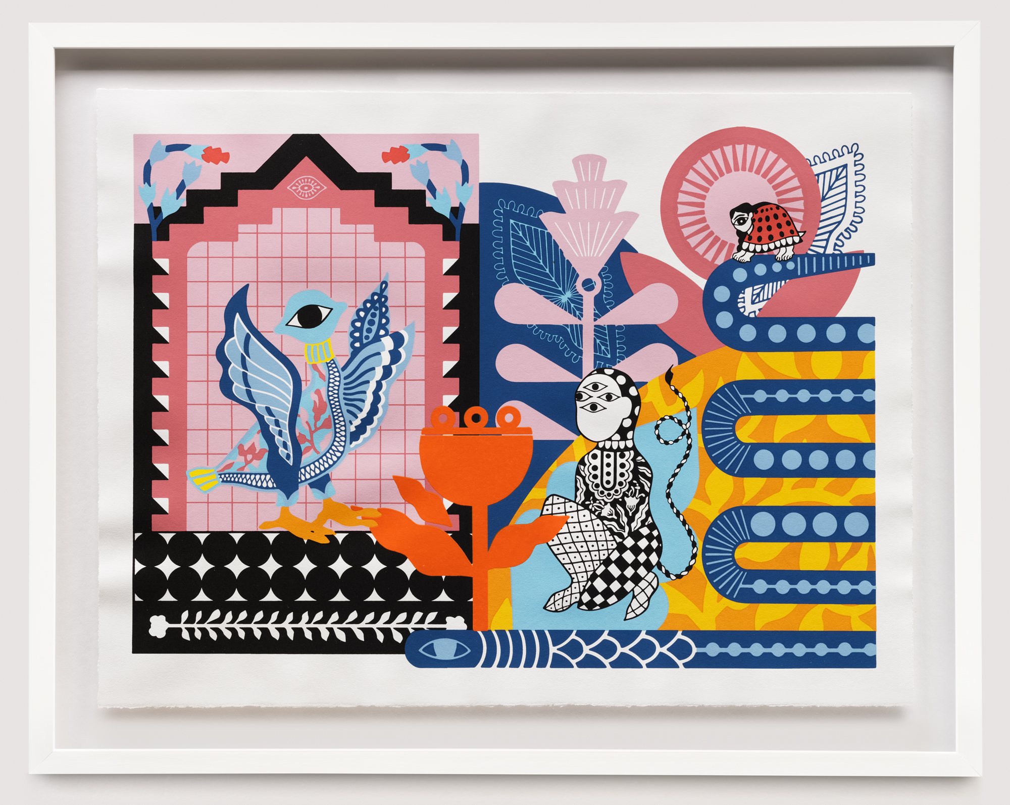 two abstracted figures against brightly multilayered coloured background with geometrical graphics..