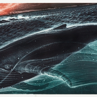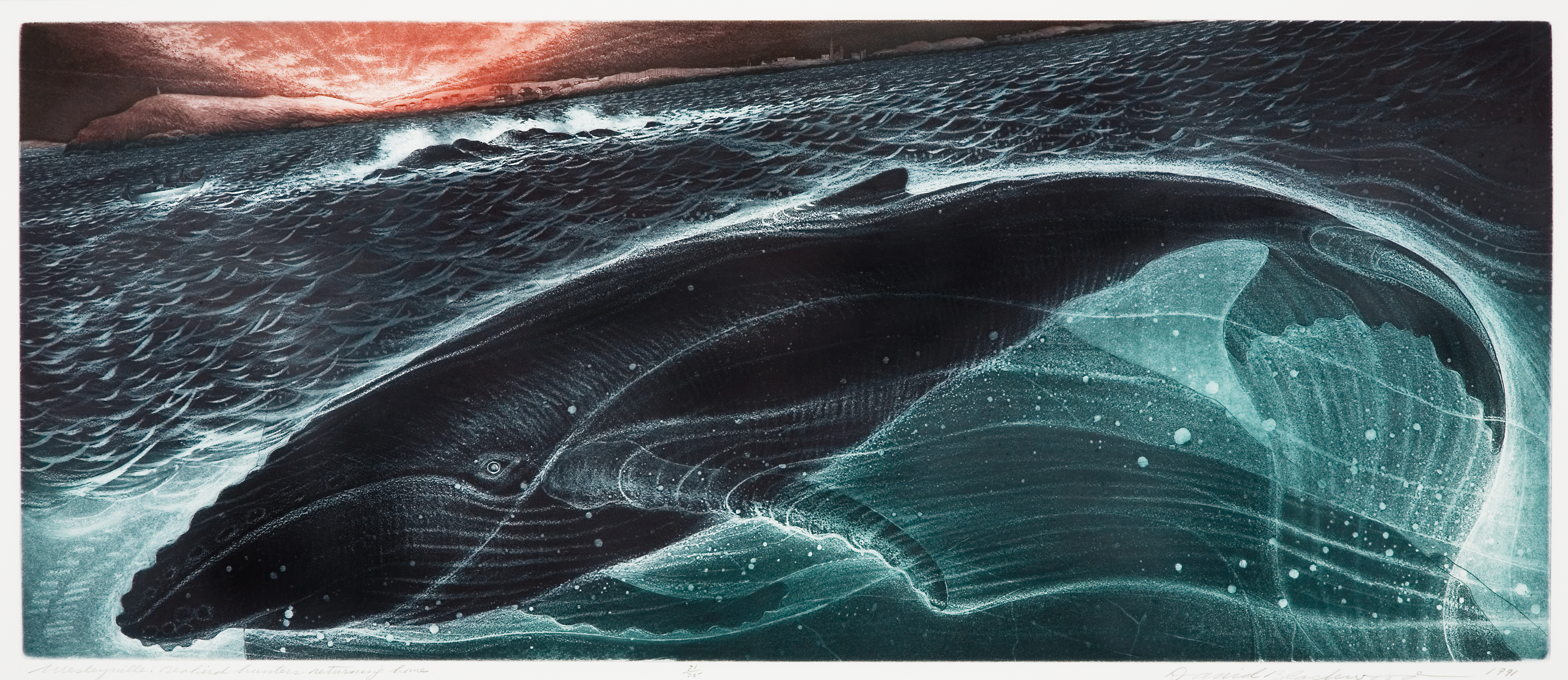 a whale swimming beneath the surface against the sun rising in the horizon.