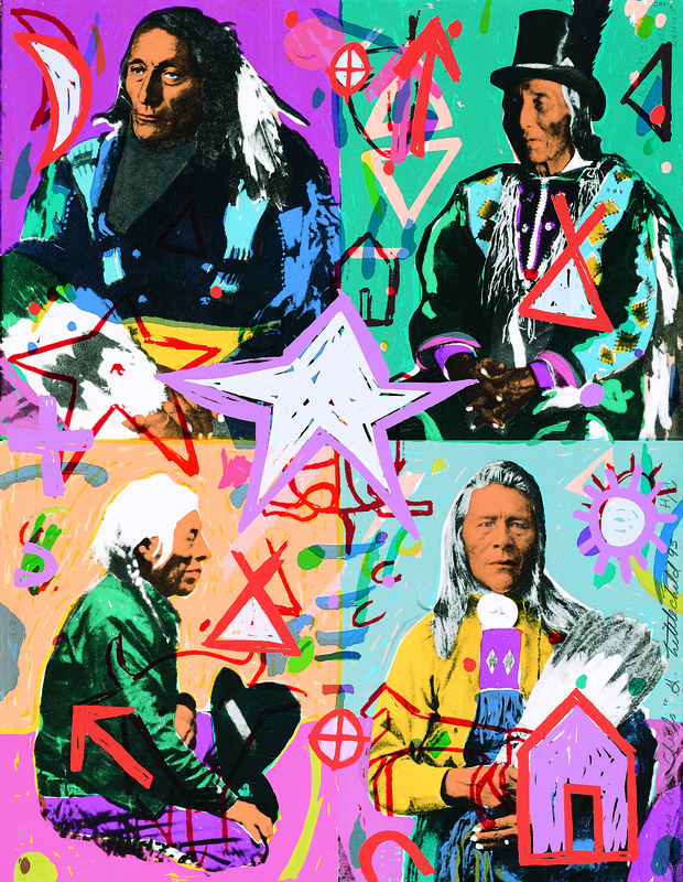 four photographs of indigenous divided into four squares superimposed with brightly coloured background and graphics.