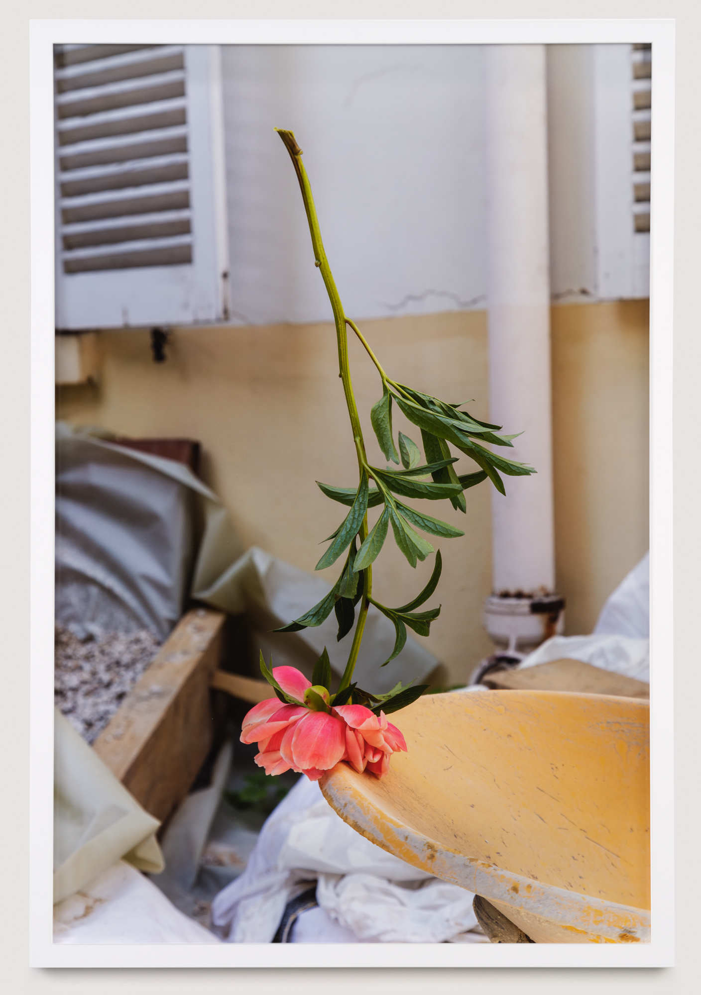 - a photograph of a pink flower, standing upside down on a yellow wheelbarrow