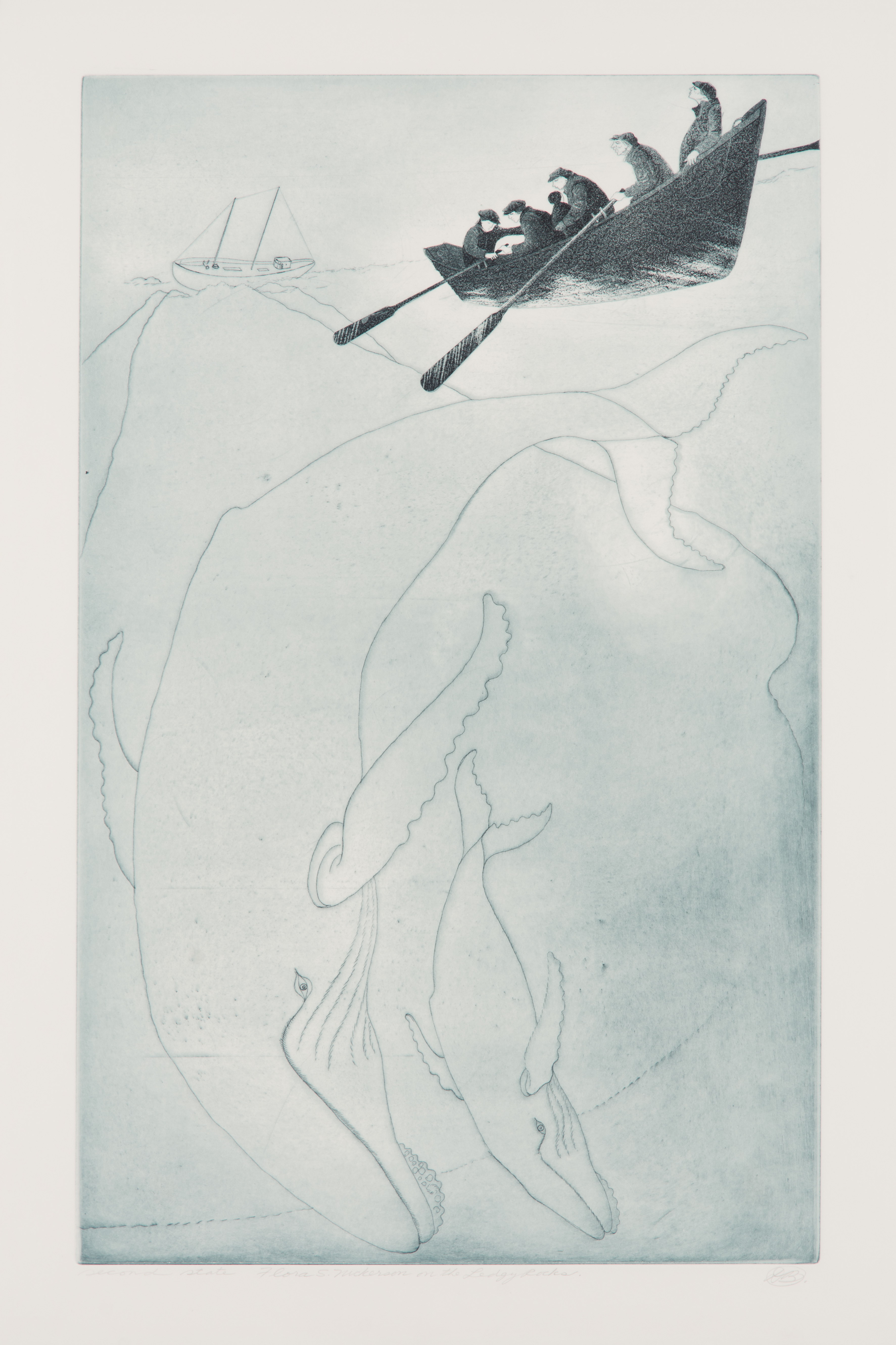two whales underwater with a small boat of sailors on the surface with a sinking ship in the background against a moonlit sky.