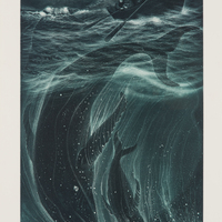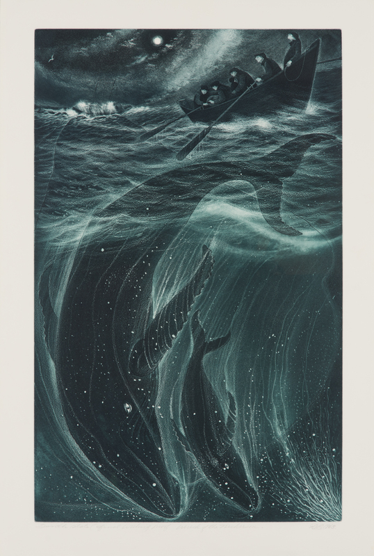 two whales underwater with a small boat of sailors on the surface with a sinking ship in the background against a moonlit sky.