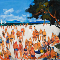 - people enjoying the beach on a clear day with blue sky,
