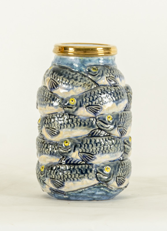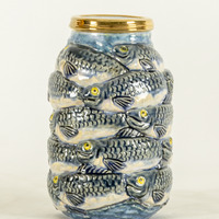 - a ceramic jar covered by fishes