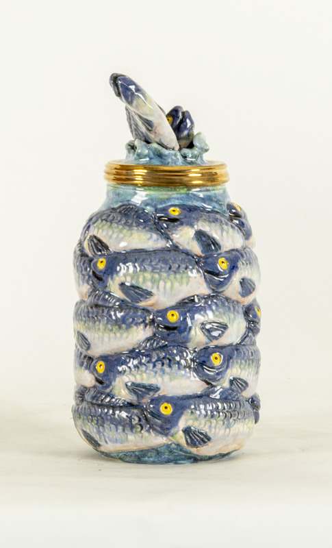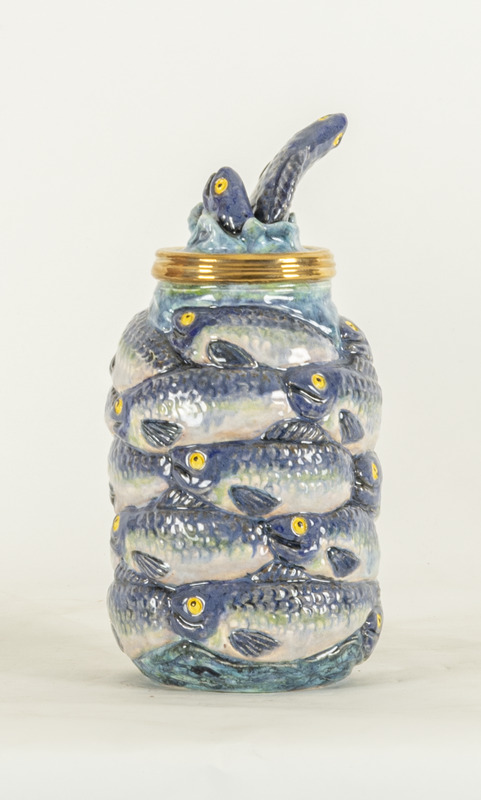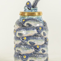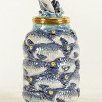- a ceramic jar covered by fishes with fishes on the lid.