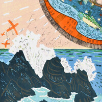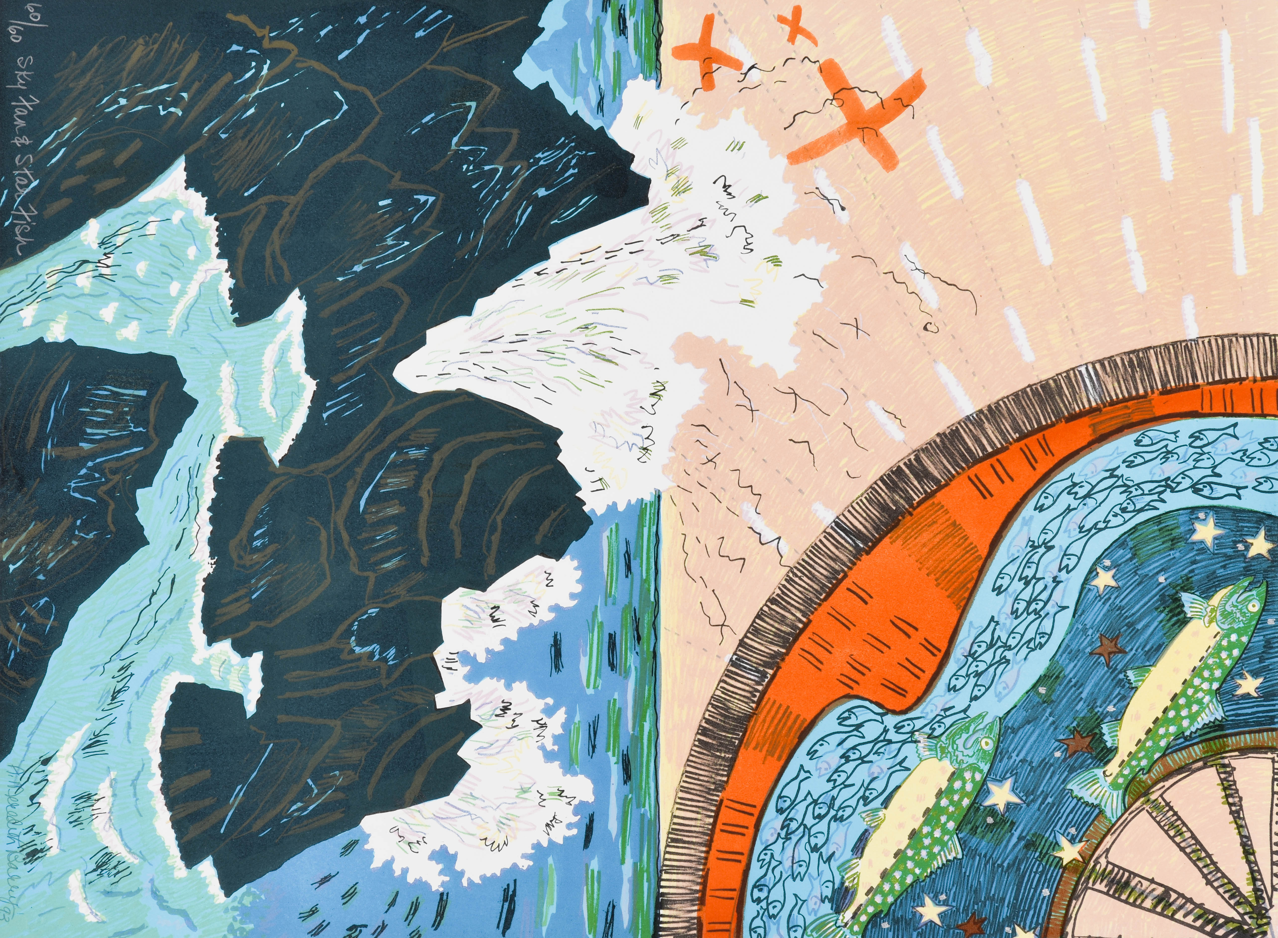 waves hitting against ocean rocks with a circular fan filled with fishes on the top right of the work.