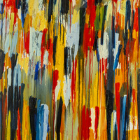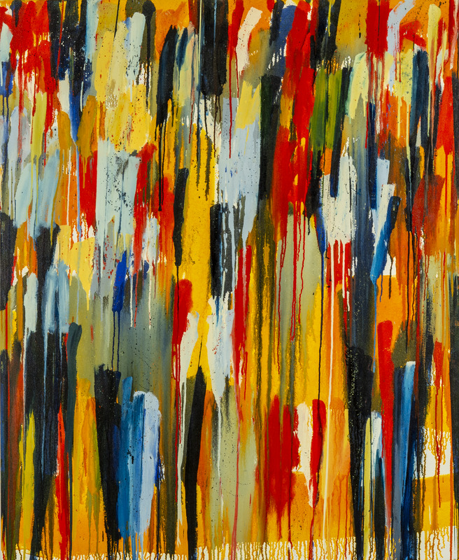 abstract vertical splashes varying colours (yellow, orange, red, dark blue, green) against a white background.