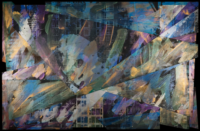 - abstracted sculptural piece with a photo of architecture superimposed onto the metal with metallic paint splashes on top.