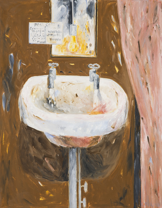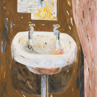 abstract image of a sink, mirror and one postcard against an brown wall with a pink abstract shape on the right side.