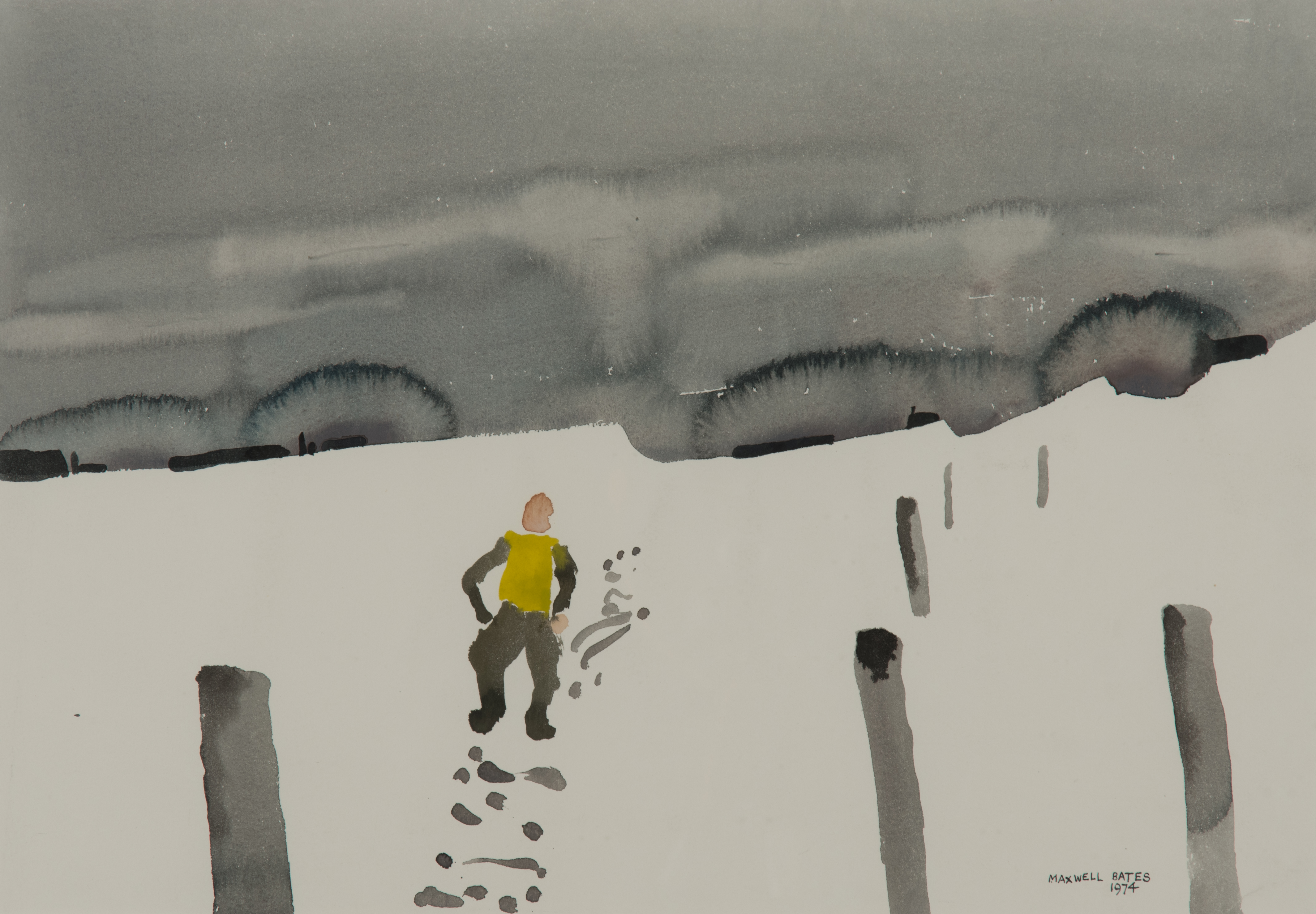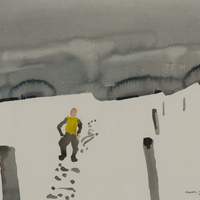 - abstract painting of a man against a snowy landscape.