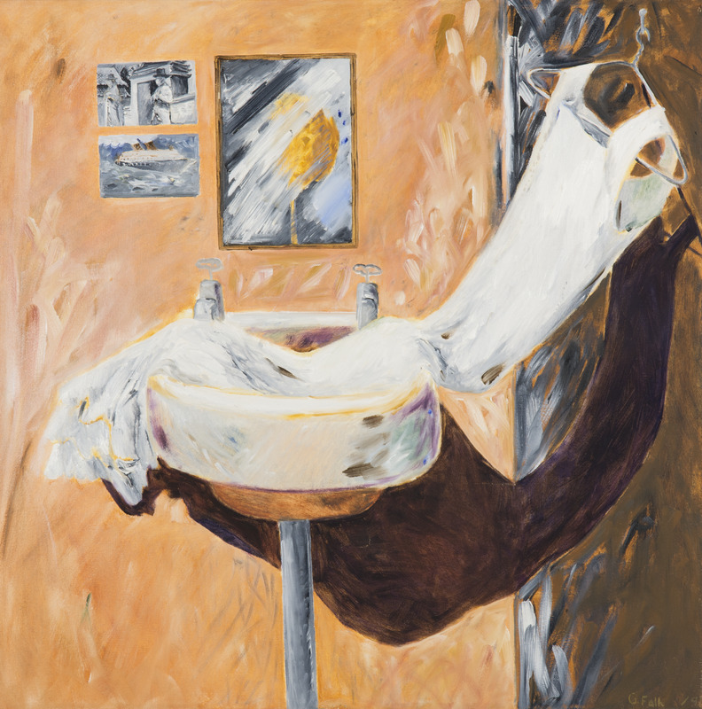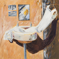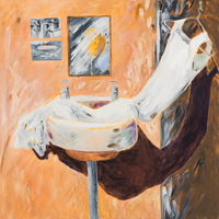 abstract image of a sink, mirror and two postcards against an orange wall with flowers on the right side against a grey background.