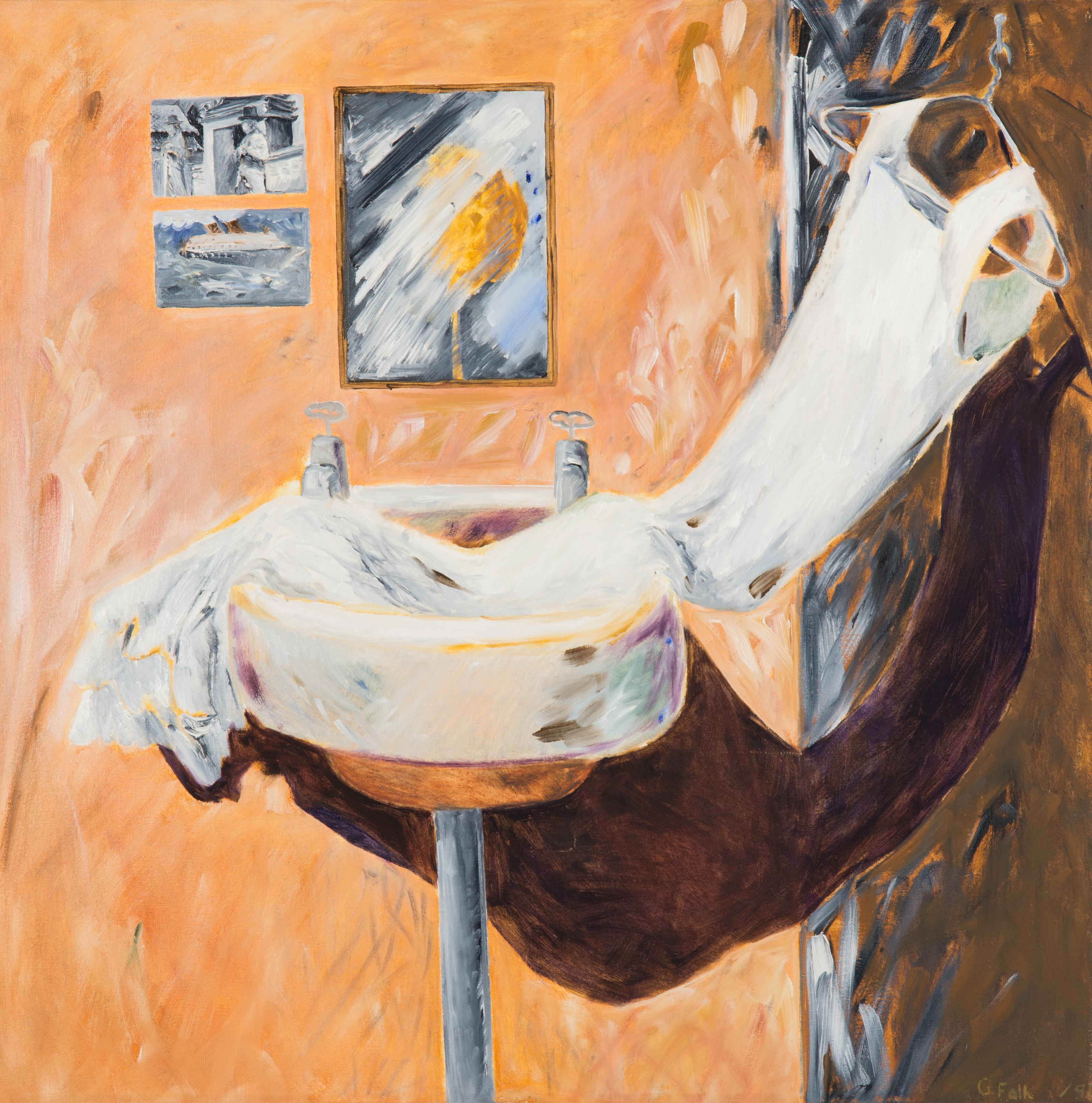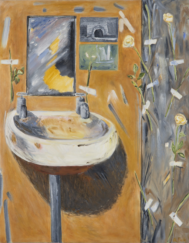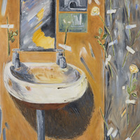 abstract image of a sink, mirror and one postcard against an brown wall with a pink abstract shape on the right side.