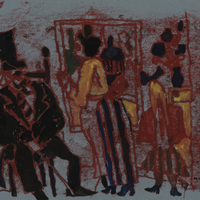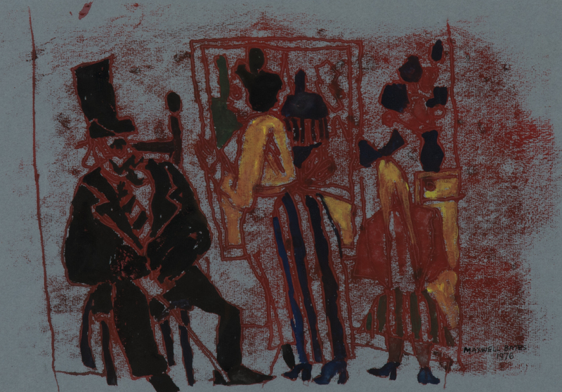 abstracted drawing of figures (both male and female) at a cocktail party