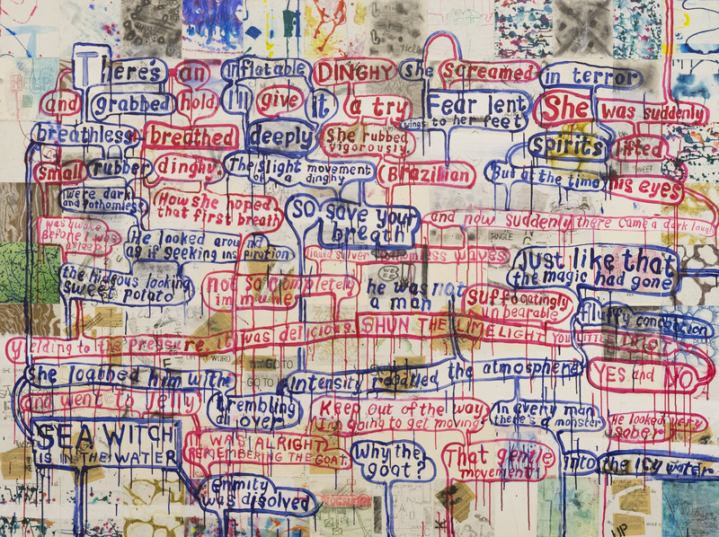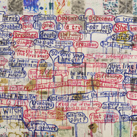 mixed media painting with multiple and overlapping speech bubbles with a collage background.