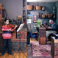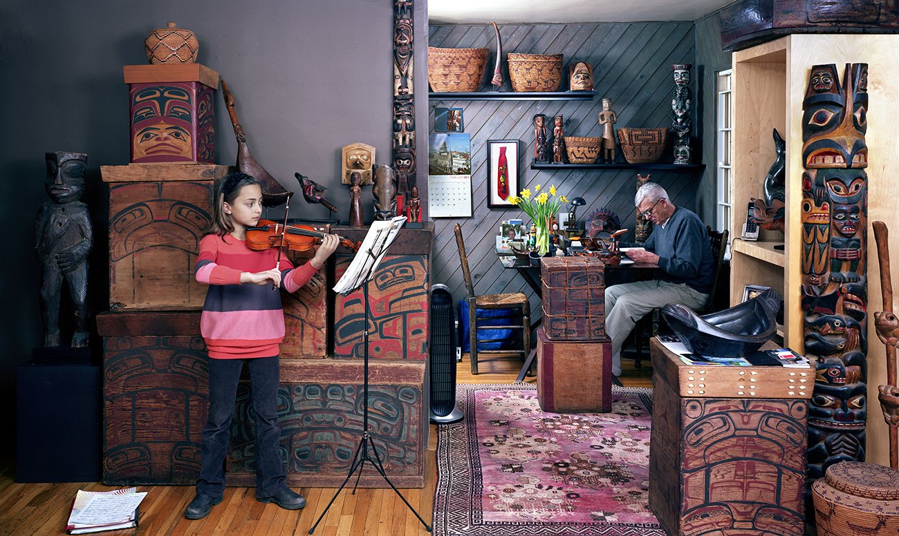 A little girl practicing violin in a room with bentwood boxes. A man sits in a neighbouring room surrounded by first nations artifacts.
