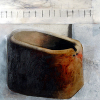 - abstract object with red substance spilling out against grey background with straight lines above.