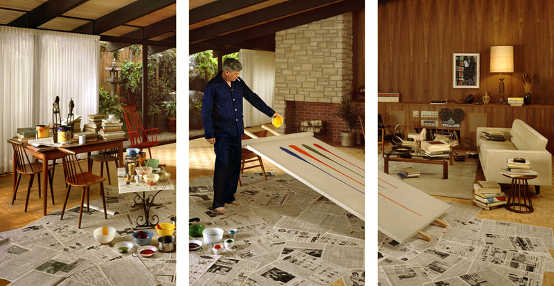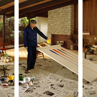 a photograph depicting a man dripping paint on a large canvas in the middle of his living room with newspaper on the floors.