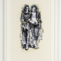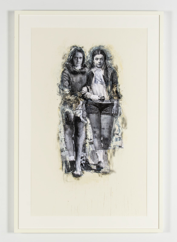 - two girls holding each other's arms, rendered in black and white with abstract smudges around them against a white background.