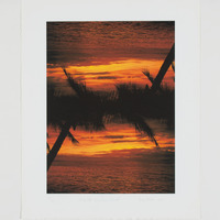 Print of a vivid tropical sunset with silhouetted palm trees mirrored to create a symmetrical reflection. The sky glows with rich hues of orange, red, and yellow