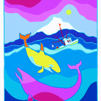 vertical abstract painting of two whales and a boat against an ocean landscape with a mountain in the background.