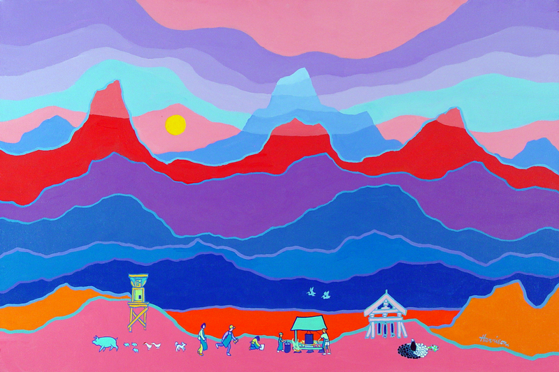 abstracted depiction of a mountainous landscape in with people, creatures, and architecture in the front.