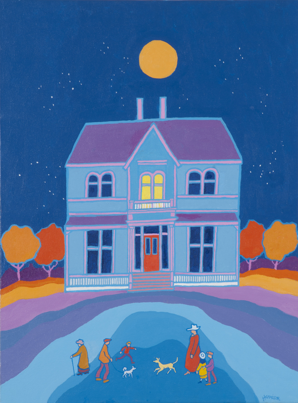 vertical acrylic painting of a house with a full moon on a dark blue background with orange trees on the sides and people and creatures in front of the house.