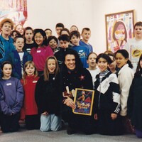 - A Photo of George Littlechild, Artists For Kids students, and Yolande Martinello.