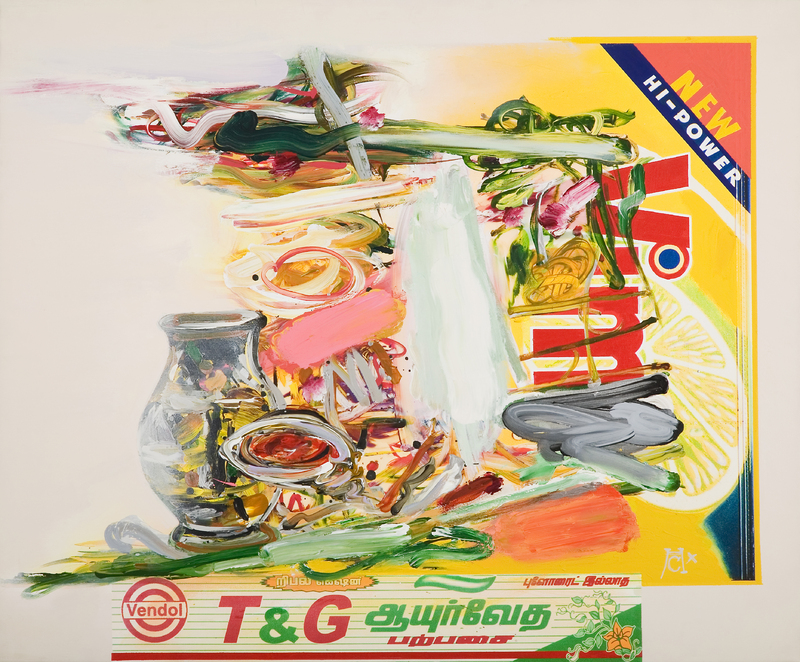 - abstract paint strokes on top of what appears to be an advertisement for New Hi-Power.