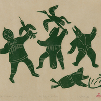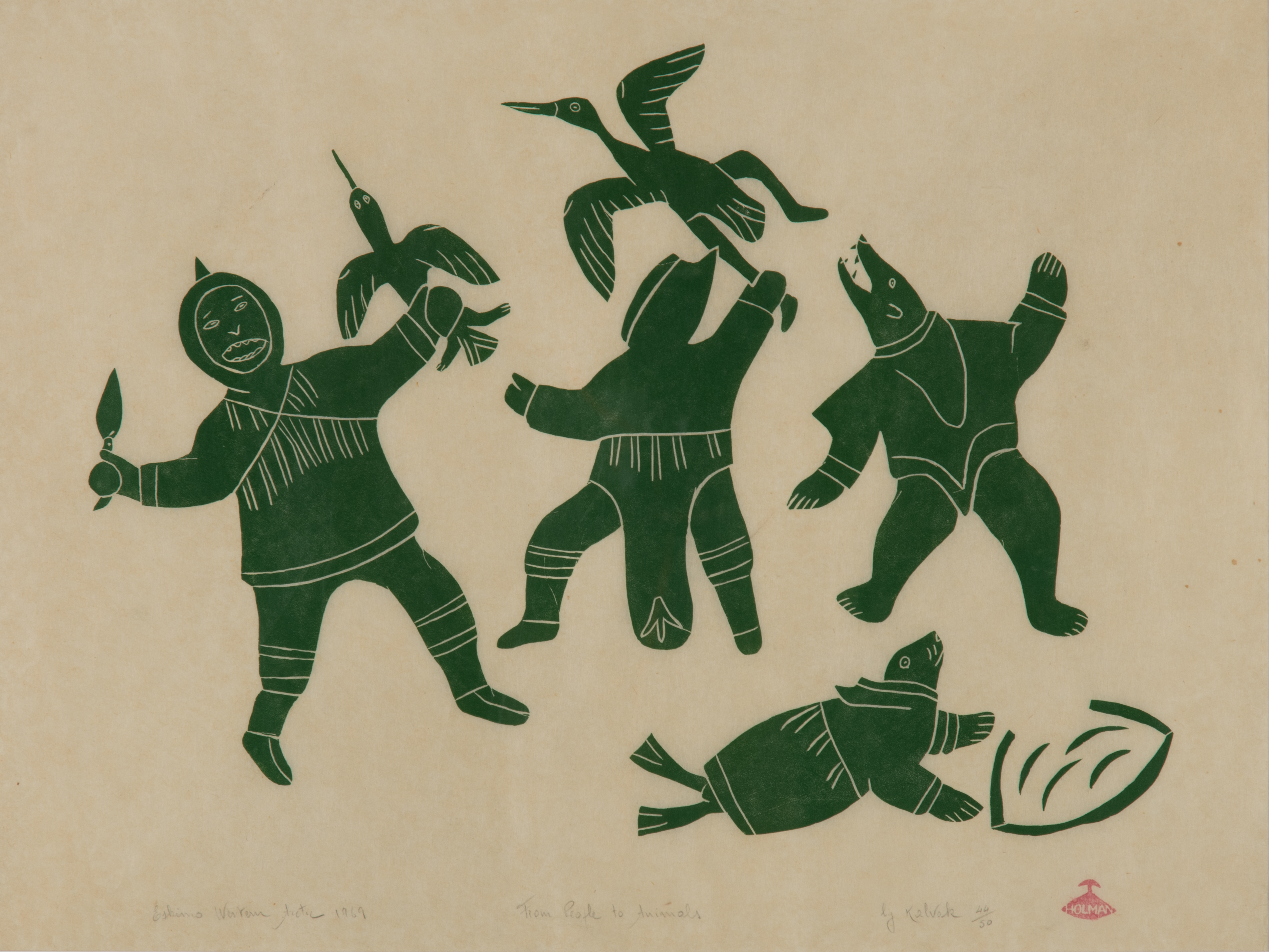 two people, trying to catch two birds, , a bear and a seal.